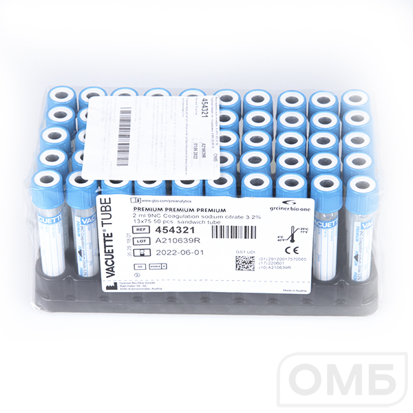 Пробирки вакуумные (2 мл, 13х75 мм,"VACUETTE" с натрия цитратом 3,2%, с двойными стенками, для гемостаза, "PREMIUM") 454321