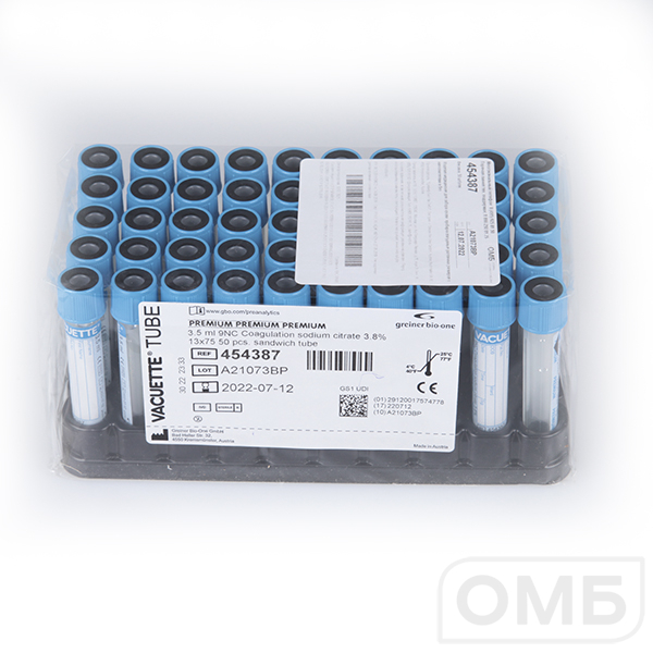 Пробирки вакуумные (3,5 мл, 13х75 мм,"VACUETTE" с натрия цитратом 3,8%, с двойными стенками, для гемостаза, "PREMIUM") 454387