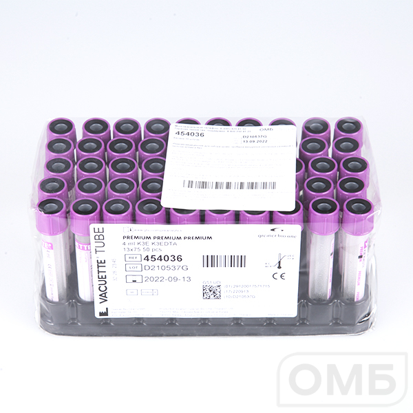 Пробирки вакуумные (4 мл, 13х75 мм, "VACUETTE" с К3 ЭДТА для гематологии, "PREMIUM") 454036