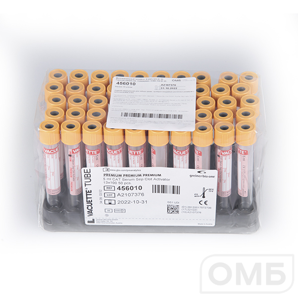 Пробирки вакуумные (5 мл, 13х100 мм, "VACUETTE", для сыворотки, с гелем, "PREMIUM", крышка желтая) 456010